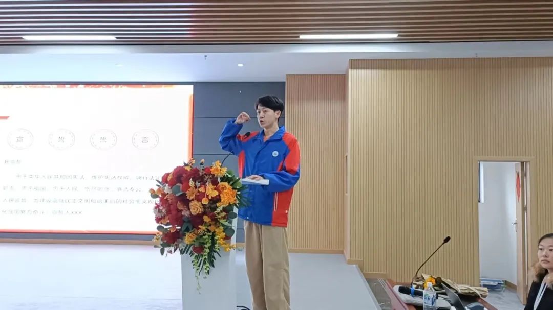 同学们庄严地接过党支部书记袁坤分发的《中华人民共和国宪法》,遵循宪法为行动指南,立志成为遵纪守法的公民,全力维护宪法与法律的权威和尊严。