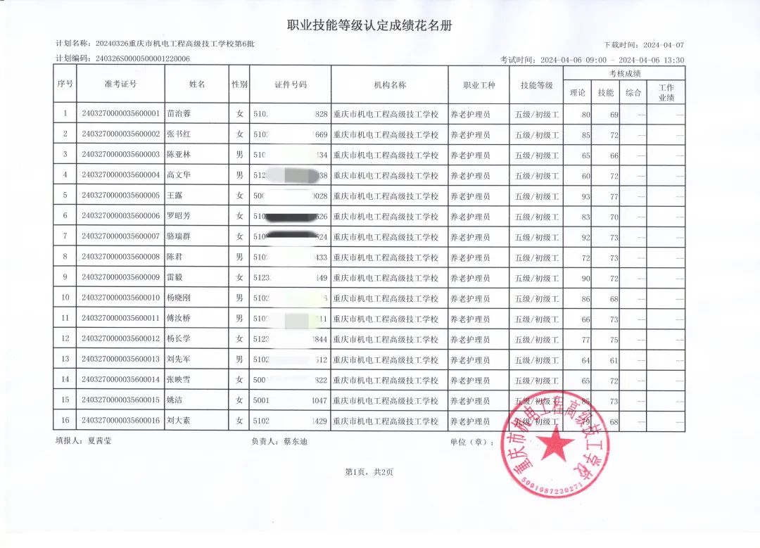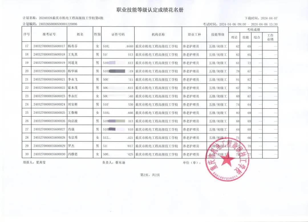 2024年4月重庆市机电工程高级技工学校市管社会培训评价组织对重庆市万盛经开区宏顺职业技能培训学校有限责任公司进行了职业技能等级认定考试。认定工种:养老护理员,等级:初级/五级,报名30人,合格人数30人。合格率为100%。现对所有考生成绩公示如下: