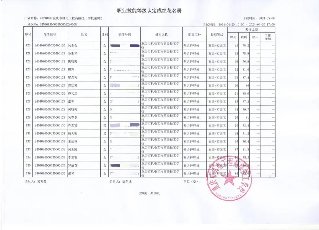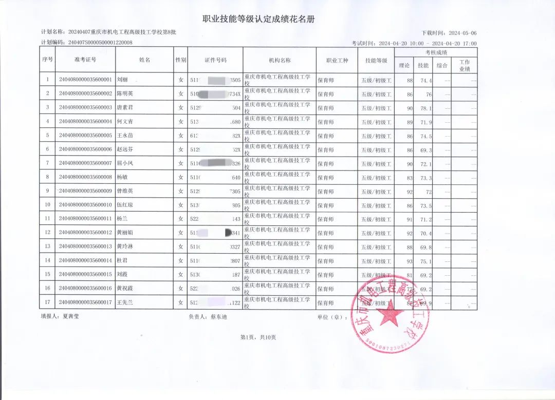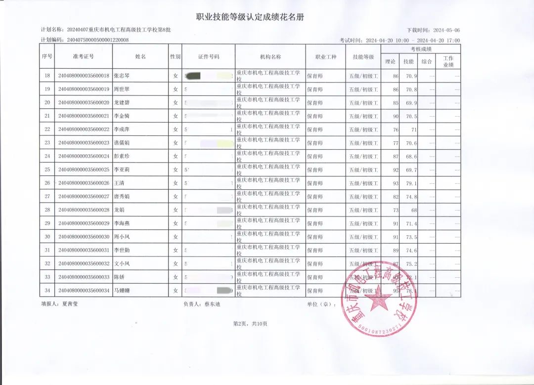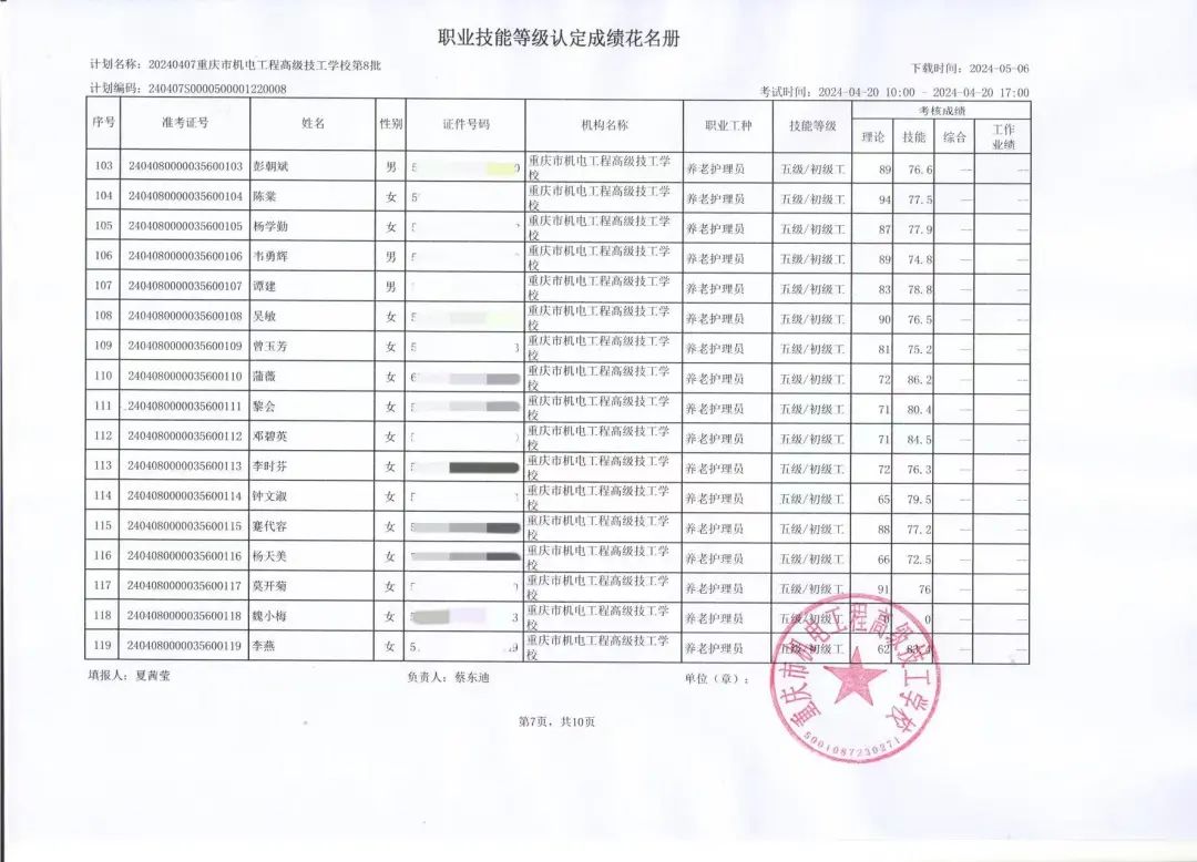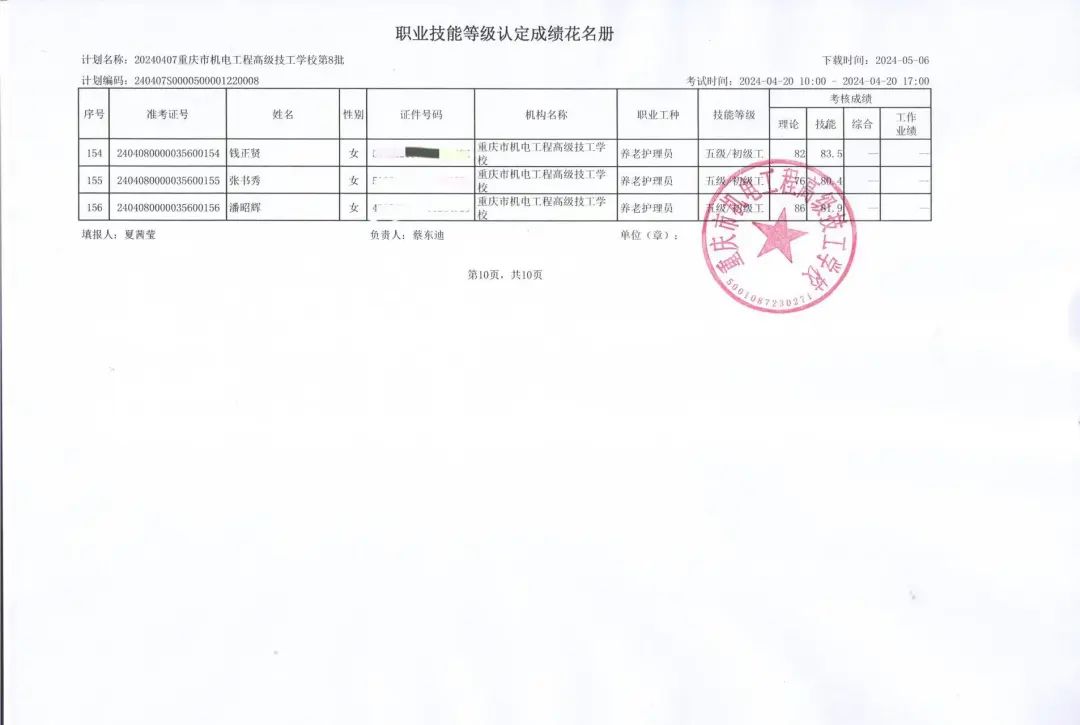 2024年4月重庆市机电工程高级技工学校市管社会培训评价组织对广安市广安区賨州姐妹职业技能培训学校、重庆香山同辉实业有限公司、重庆市九龙坡区萌娘职业培训学校等社会人员进行了职业技能等级认定考试。认定工种:保育师、养老护理员,等级:高级/三级,中级/四级,初级/五级,报名156人,合格人数143人,缺考8人。合格率为92%。