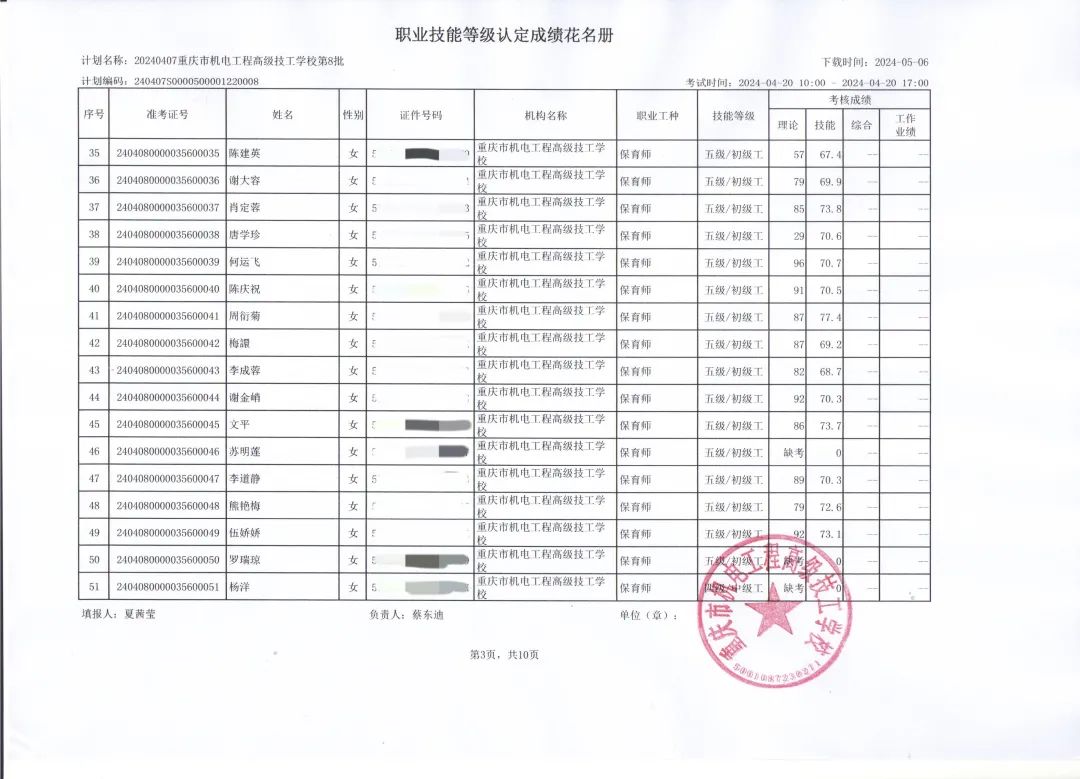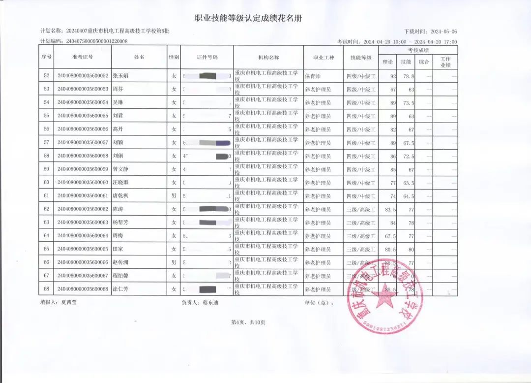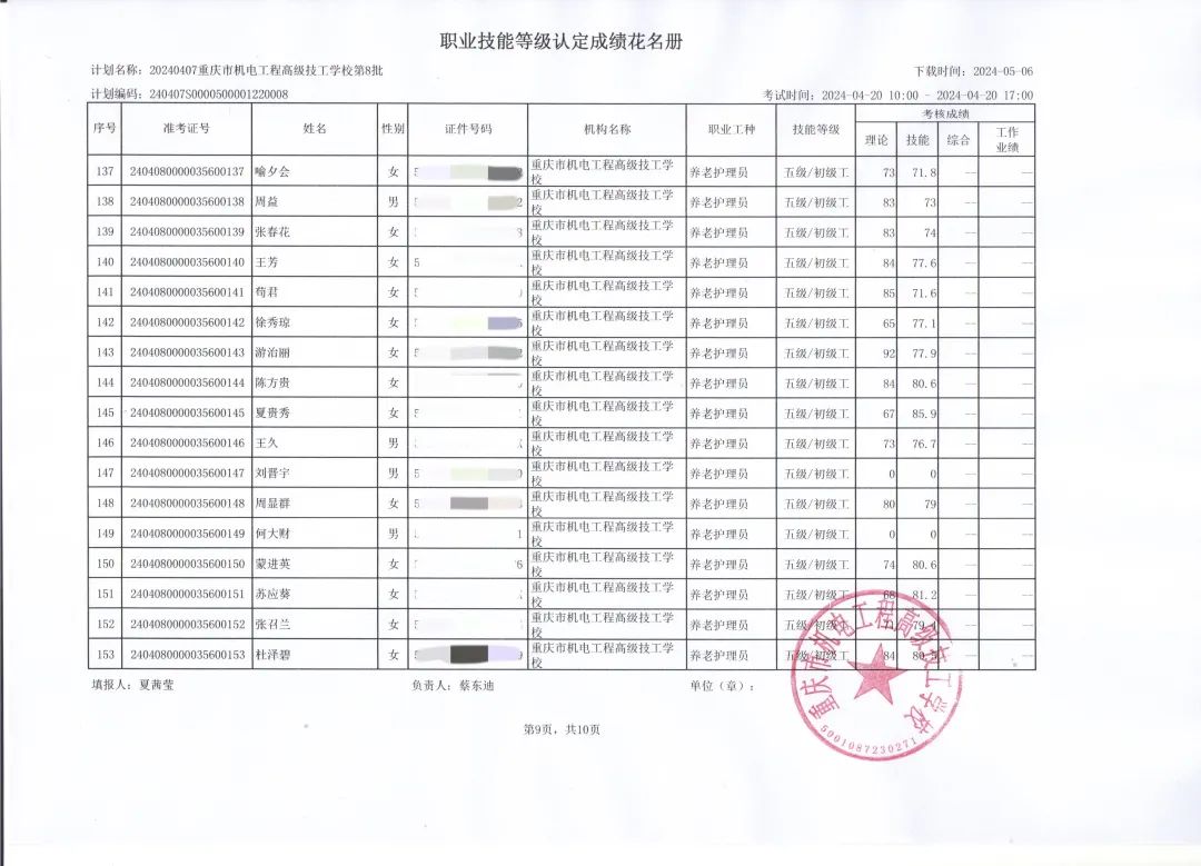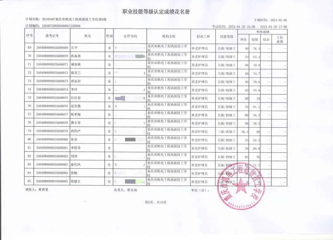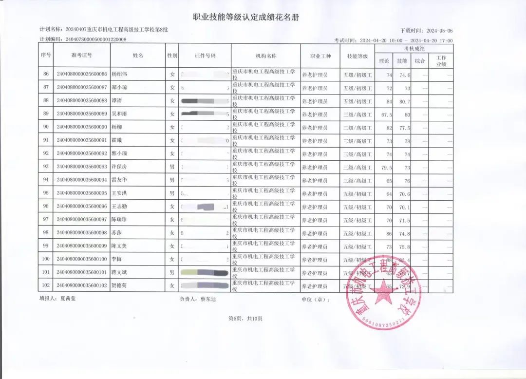 2024年4月重庆市机电工程高级技工学校市管社会培训评价组织对广安市广安区賨州姐妹职业技能培训学校、重庆香山同辉实业有限公司、重庆市九龙坡区萌娘职业培训学校等社会人员进行了职业技能等级认定考试。认定工种:保育师、养老护理员,等级:高级/三级,中级/四级,初级/五级,报名156人,合格人数143人,缺考8人。合格率为92%。