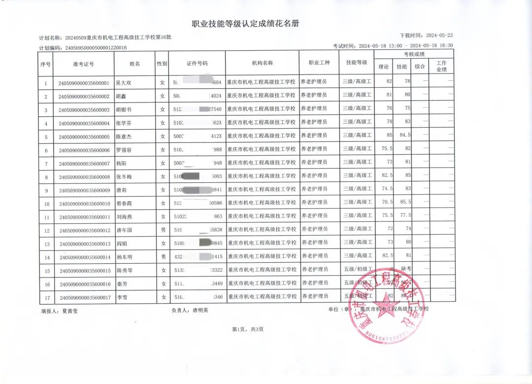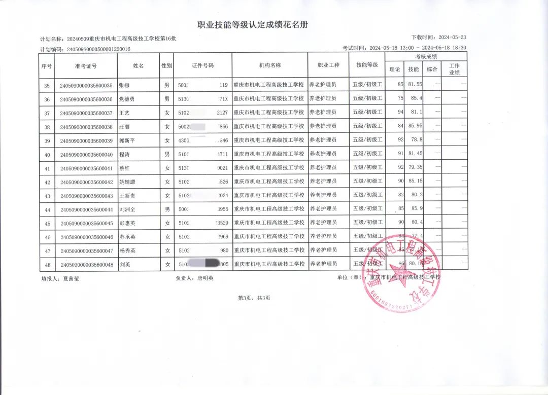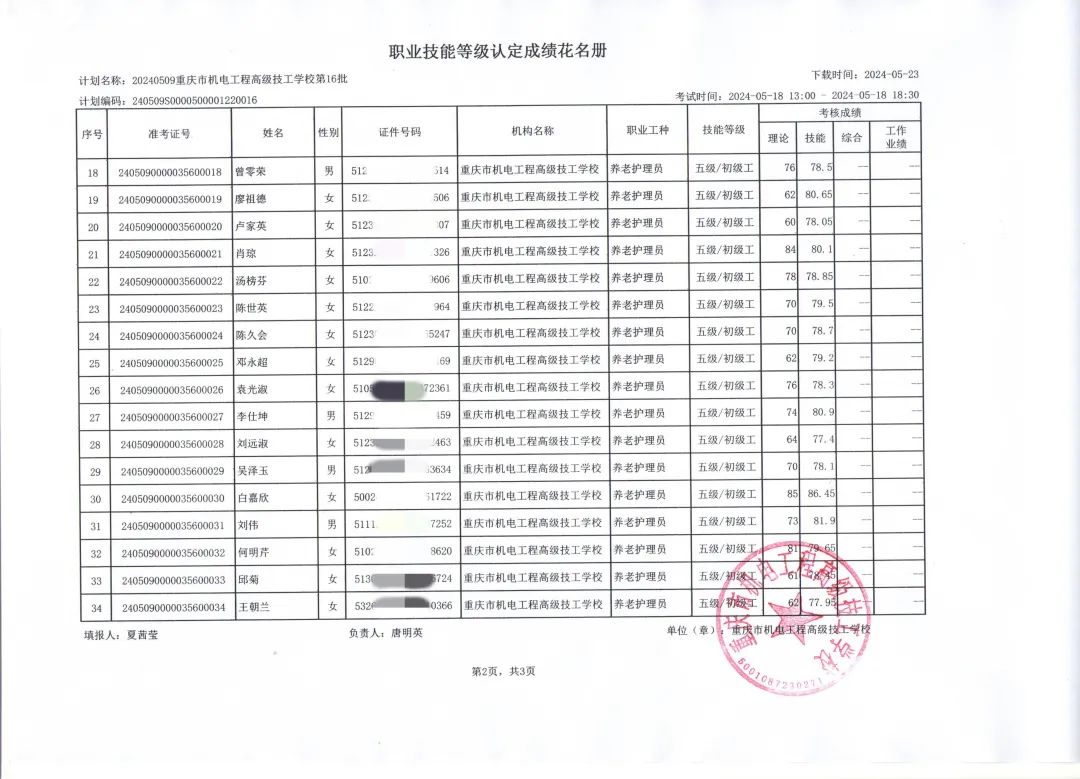 2024年5月重庆市机电工程高级技工学校市管社会培训评价组织对重庆弘爱健康医疗实业有限公司九龙坡健康养老服务分公司、重庆新里程康华医院等社会人员进行了职业技能等级认定考试。认定工种:养老护理员,等级:高级/三级、初级/五级,报名48人,合格人数47人,缺考1人。合格率为98%。