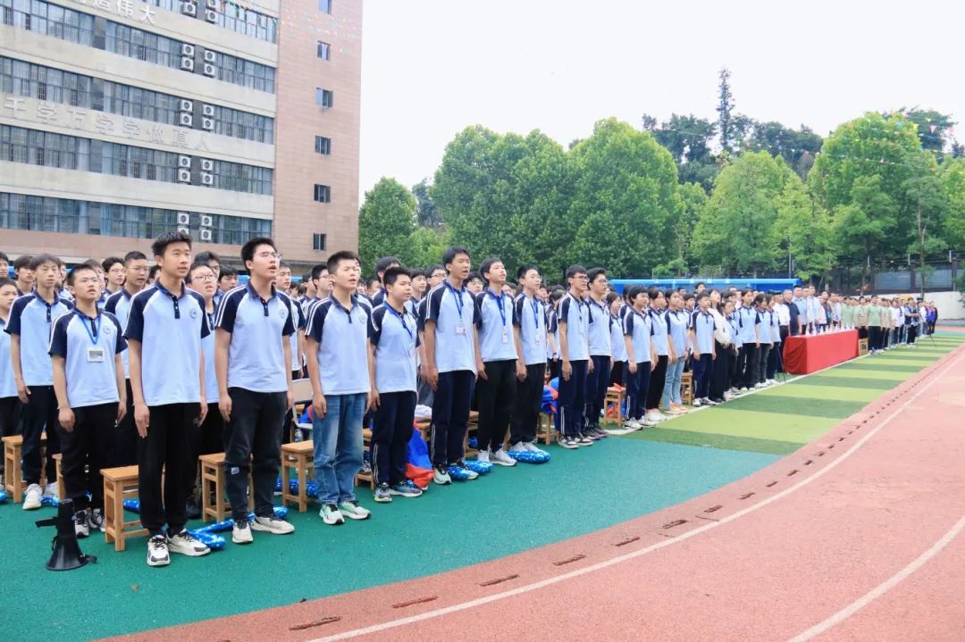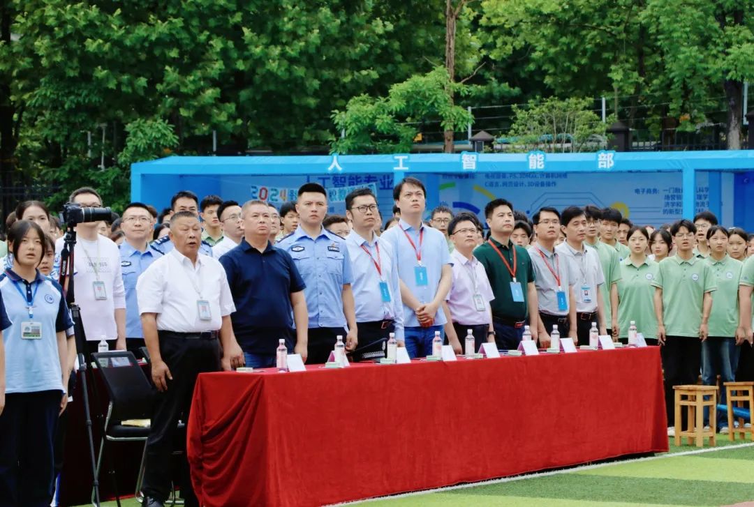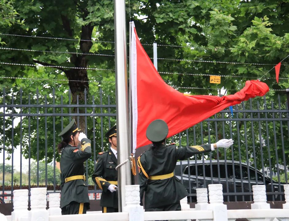 伴随着庄严的国歌声,五星红旗冉冉升起,全场师生肃立,目光紧随旗帜,向国旗致以崇高的敬意。