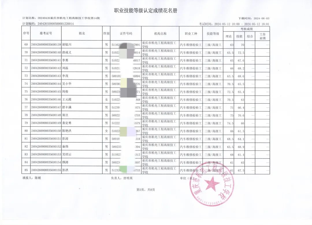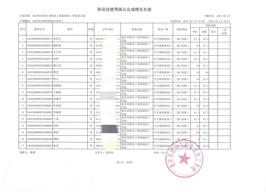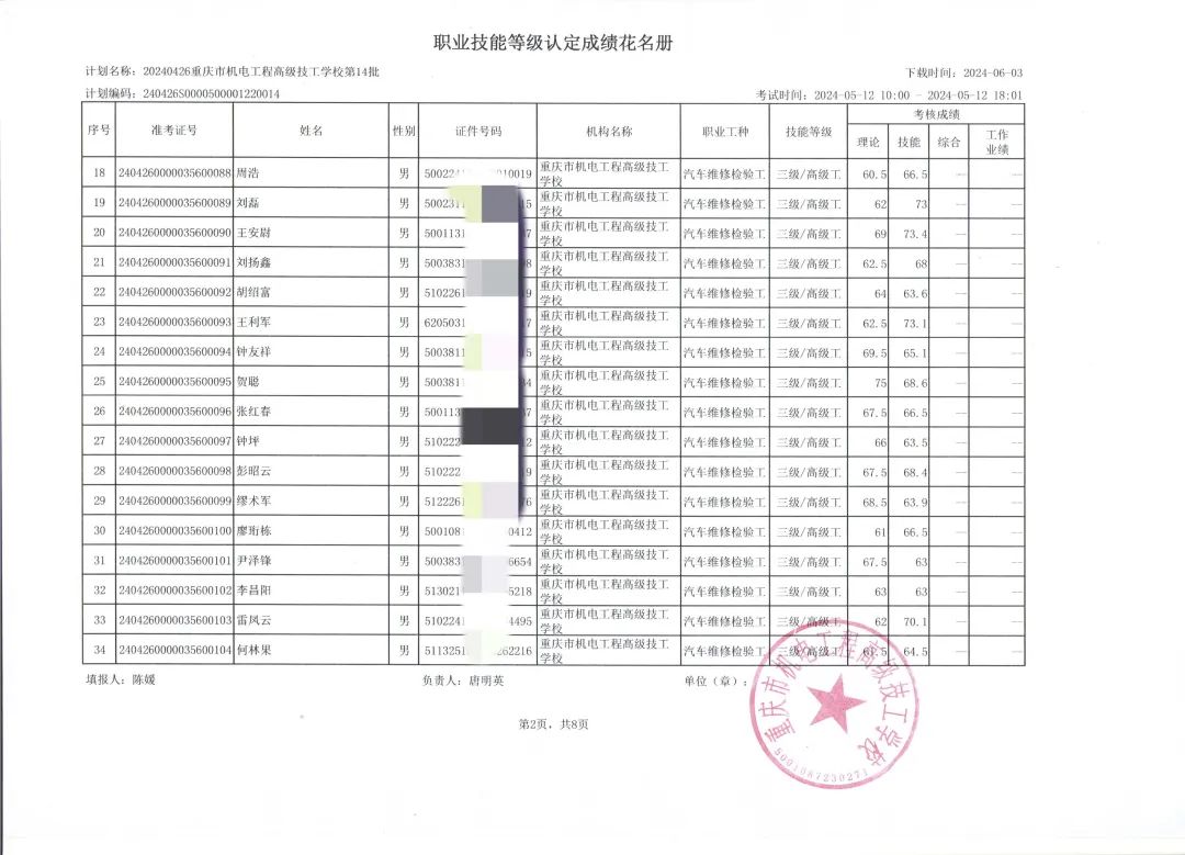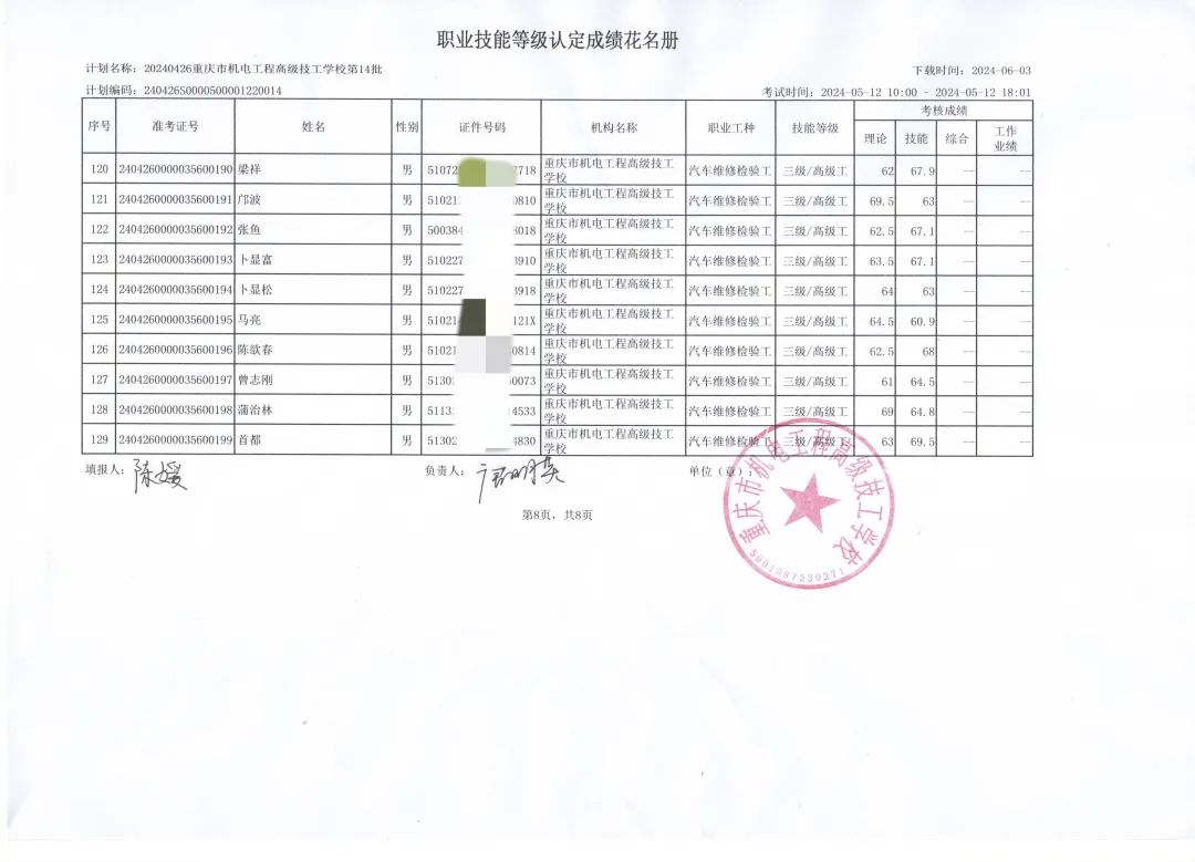 2024年5月重庆市机电工程高级技工学校市管社会培训评价组织对重庆迪马工业有限责任公司的社会人员进行了职业技能等级认定考试。认定工种:汽车维修检验工,等级:高级/三级,报名129人,合格人数125人。合格率为97%。
