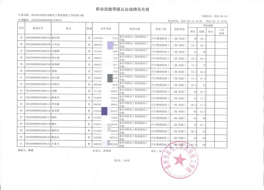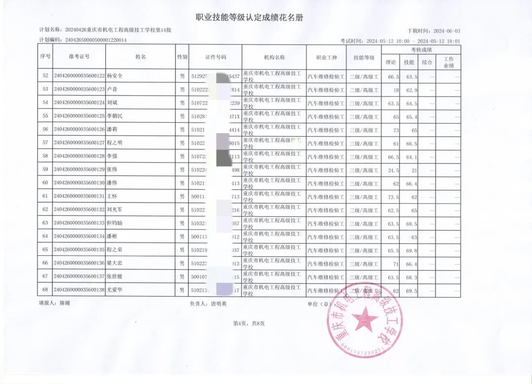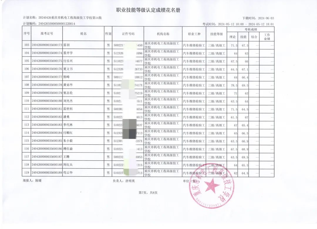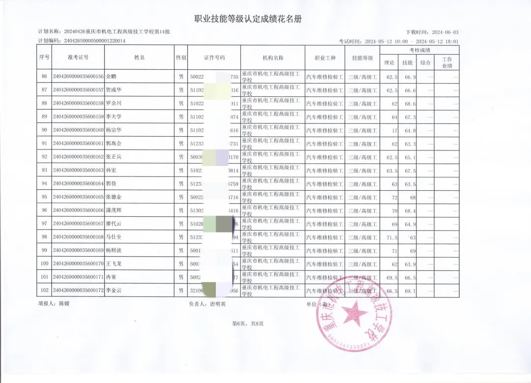 2024年5月重庆市机电工程高级技工学校市管社会培训评价组织对重庆迪马工业有限责任公司的社会人员进行了职业技能等级认定考试。认定工种:汽车维修检验工,等级:高级/三级,报名129人,合格人数125人。合格率为97%。
