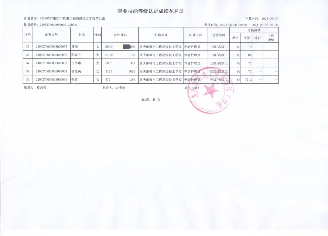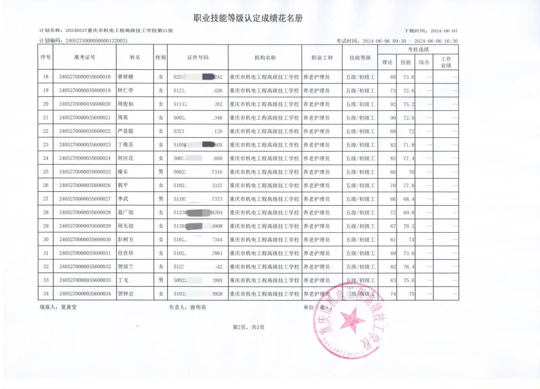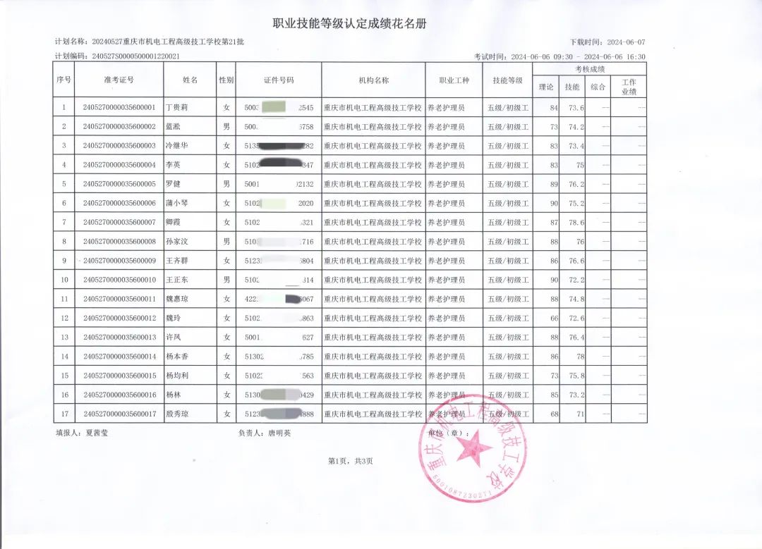 2024年6月重庆市机电工程高级技工学校市管社会培训评价组织对重庆市渝北区森林海养老院、重庆市永川区淘金职业技术学校等社会人员进行了职业技能等级认定考试。认定工种:养老护理员,等级:高级/三级,初级/五级,报名39人,合格人数39人。合格率为100%。