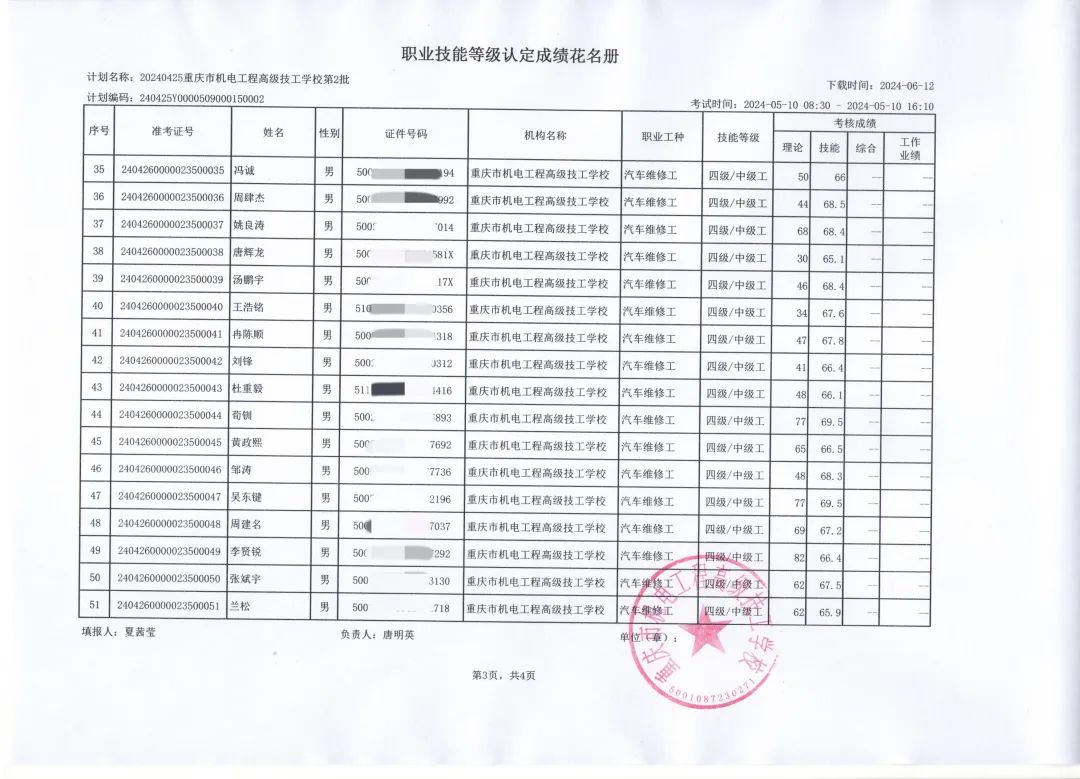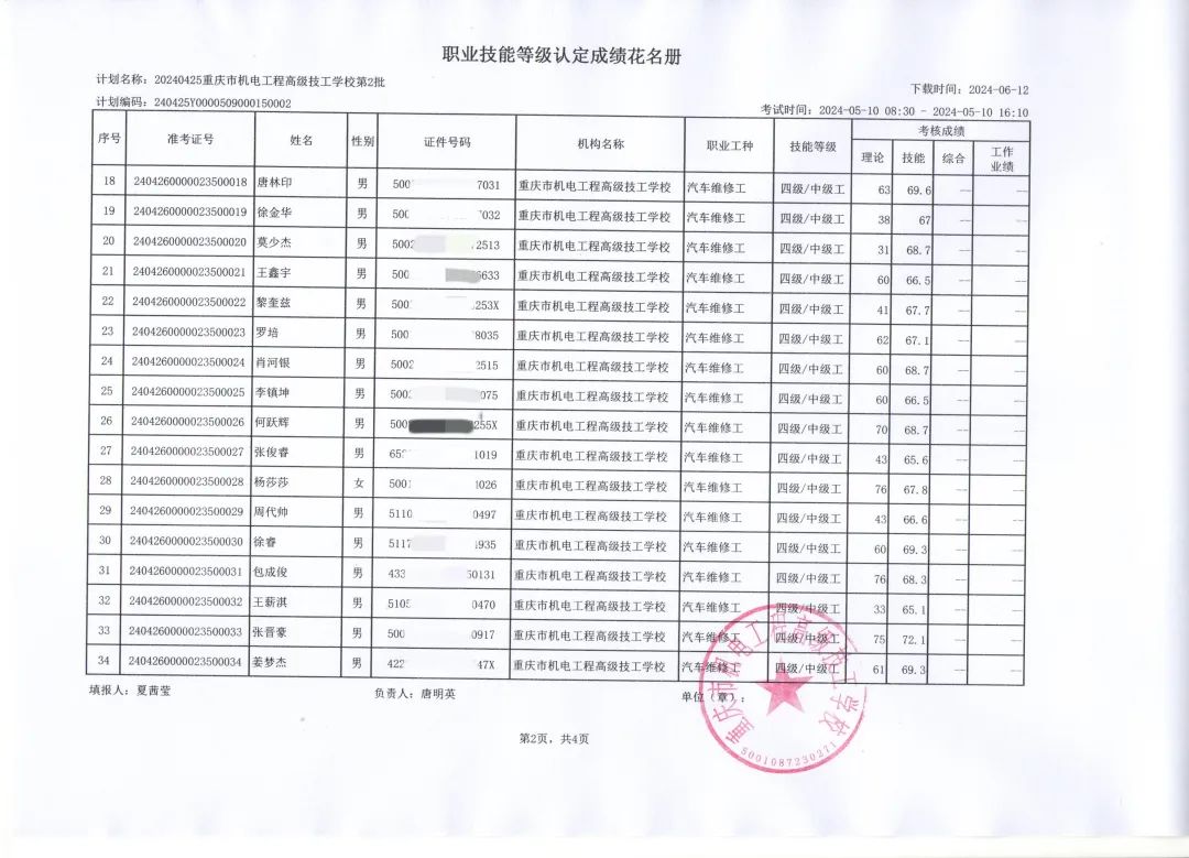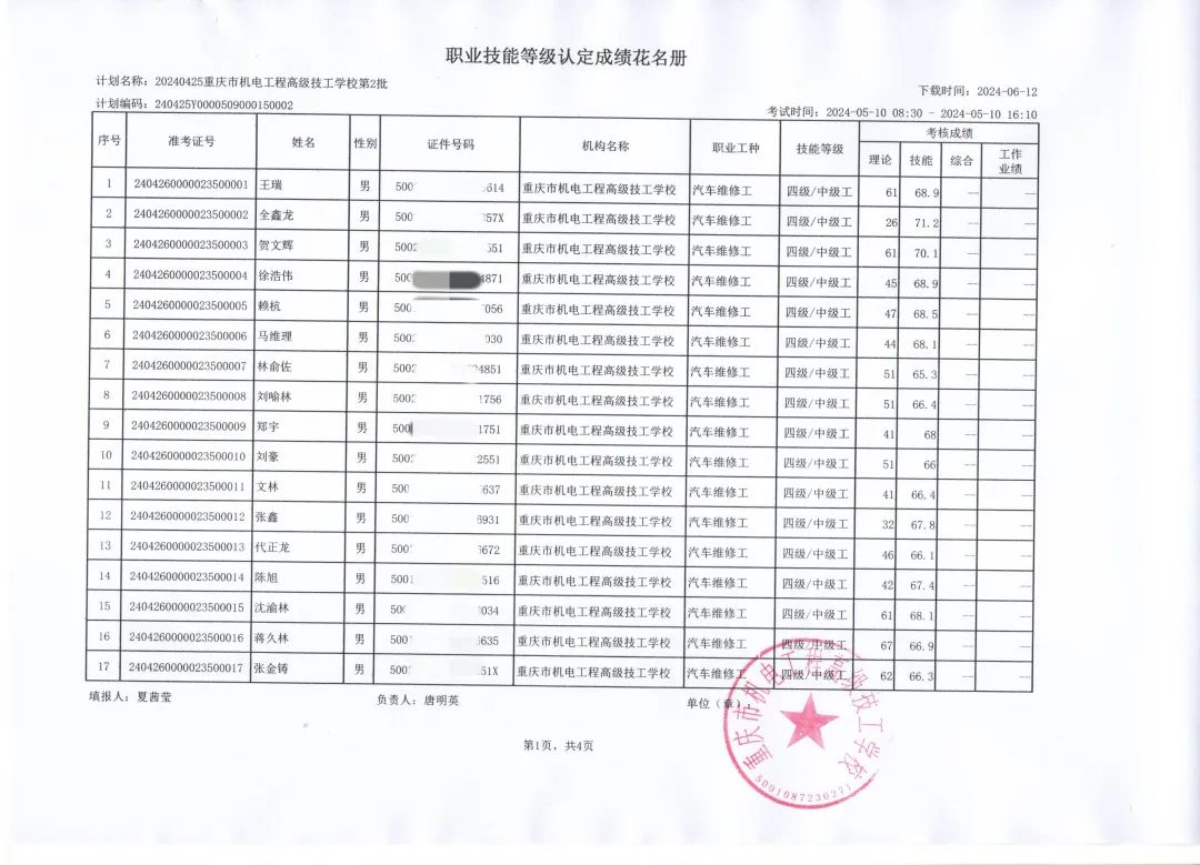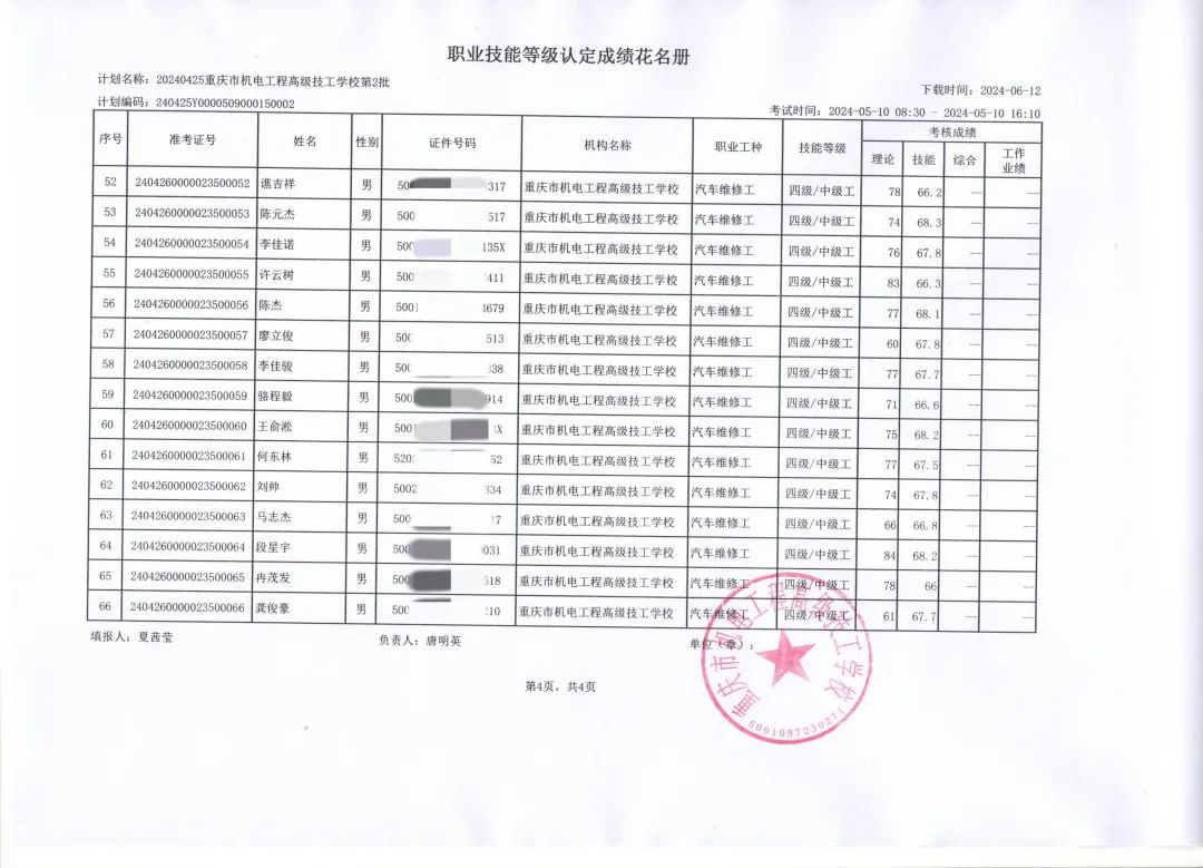 2024年5月,重庆市机电工程高级技工学校举行了汽车维修工职业技能等级认定考试(四级/中级)。我校学生报考汽车维修工考试人数66人,合格39人,合格率59%。
