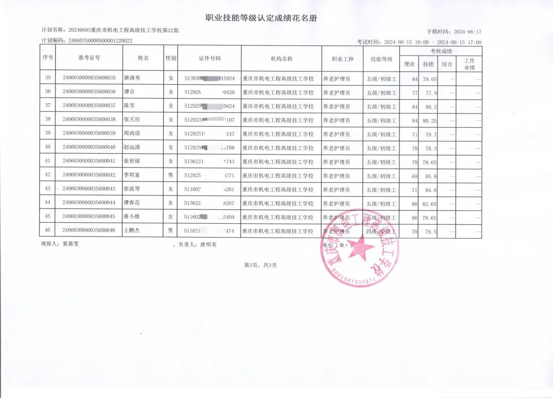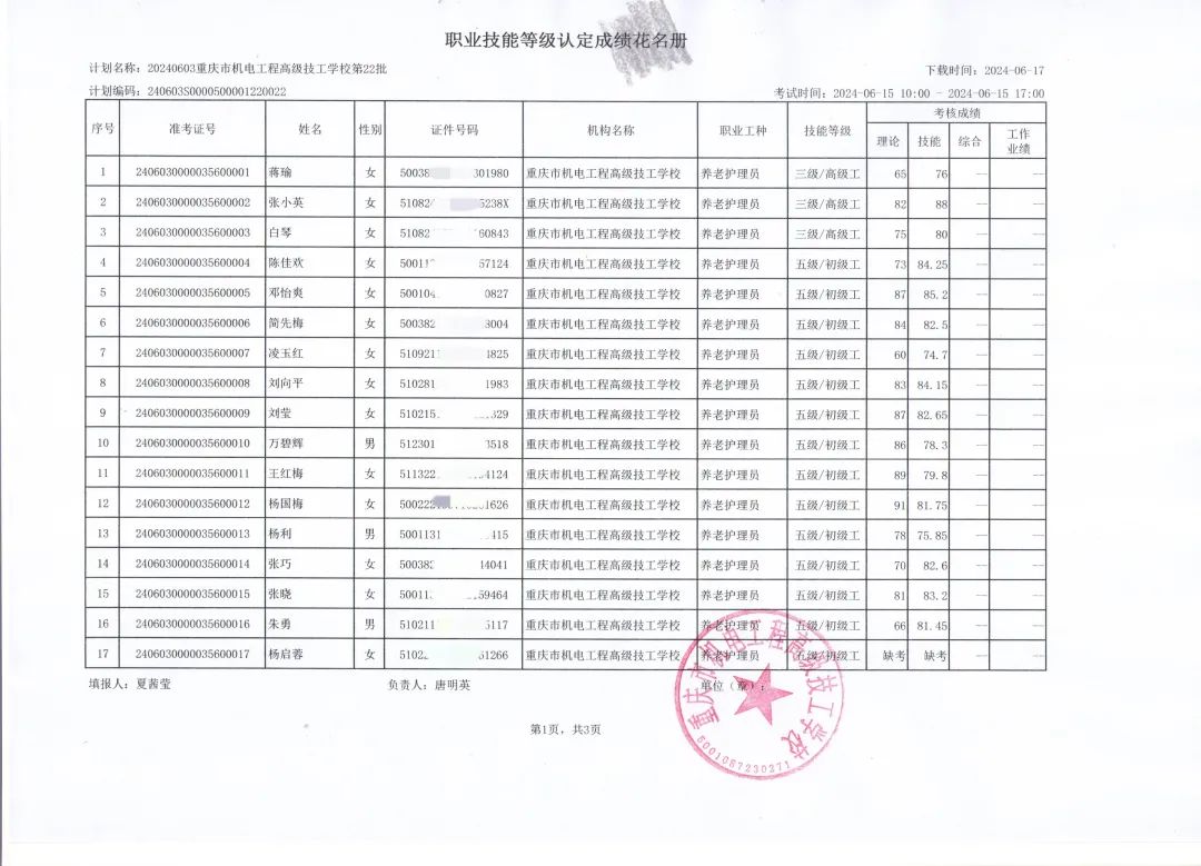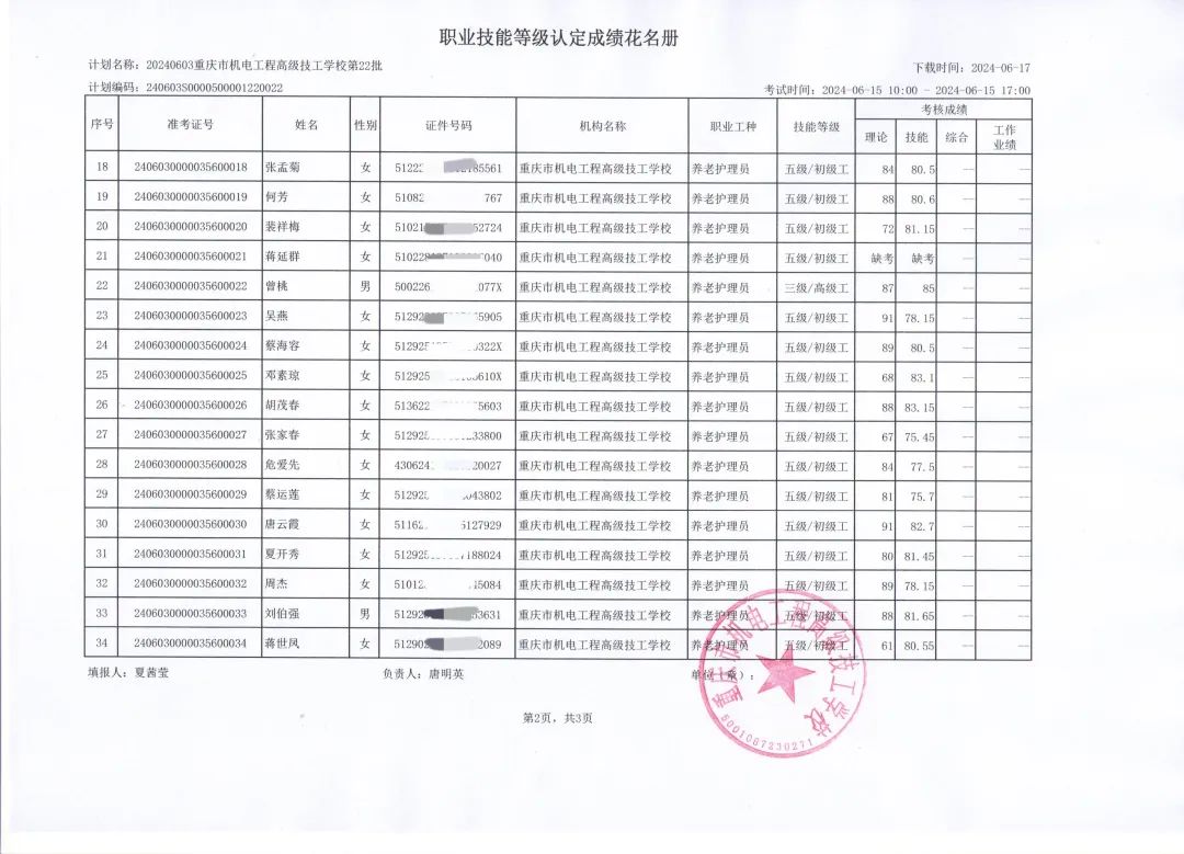 2024年6月重庆市机电工程高级技工学校市管社会培训评价组织对重庆康之缘健康管理有限公司等社会人员进行了职业技能等级认定考试。认定工种:养老护理员,等级:高级/三级,中级/四级,初级/五级,报名46人,合格人数44人,缺考2人。有效合格率为100%。