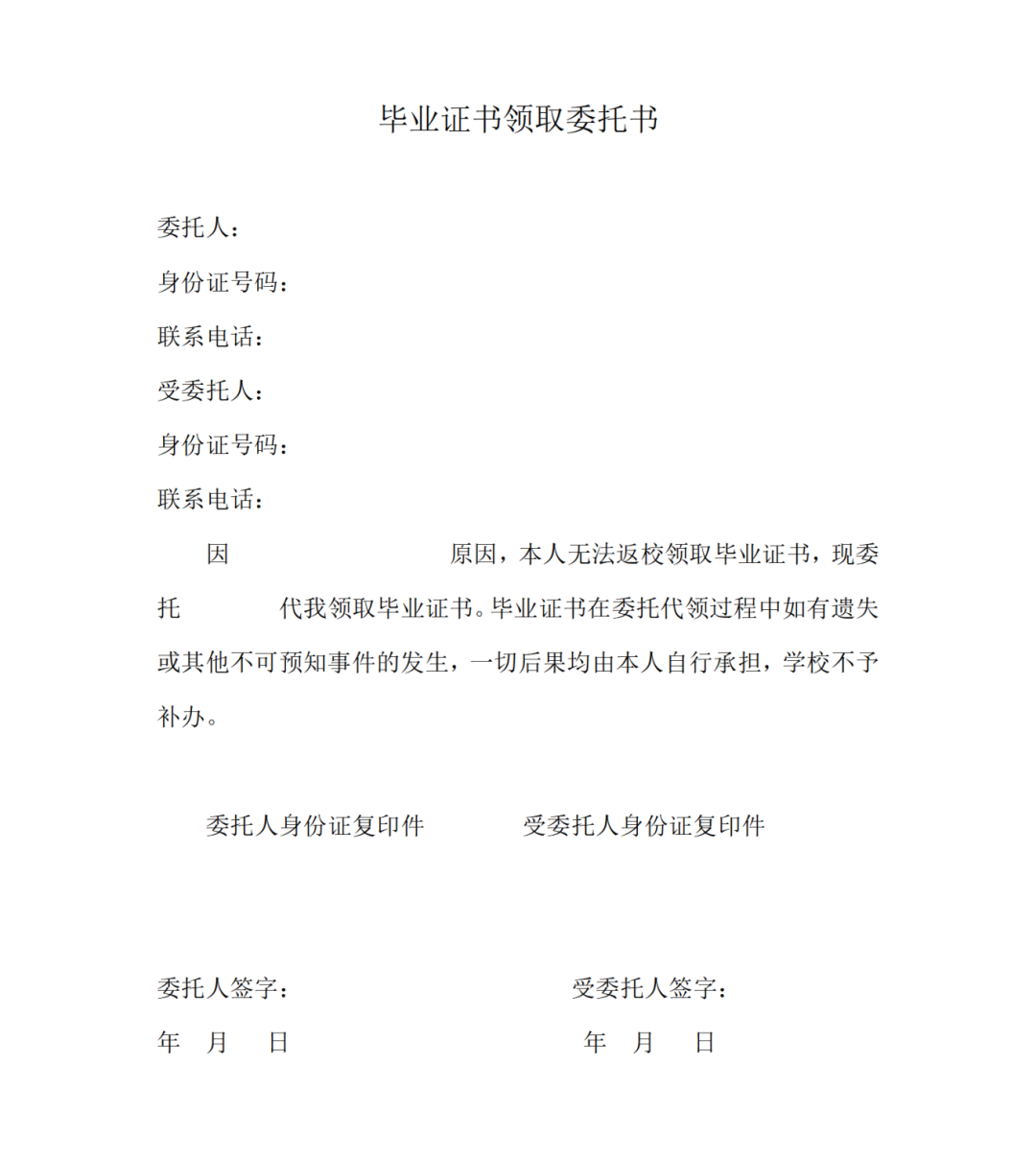 1. 毕业证由本人携带身份证来校领取,如因特殊原因不能及时到校领取而又急需毕业证的请委托他人办理,办理时请提供双方身份证复印件及委托书(委托书模板见下图)。重要提示:毕业证遗失后无法补办,建议学生本人亲自领取!!!