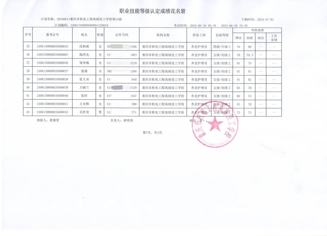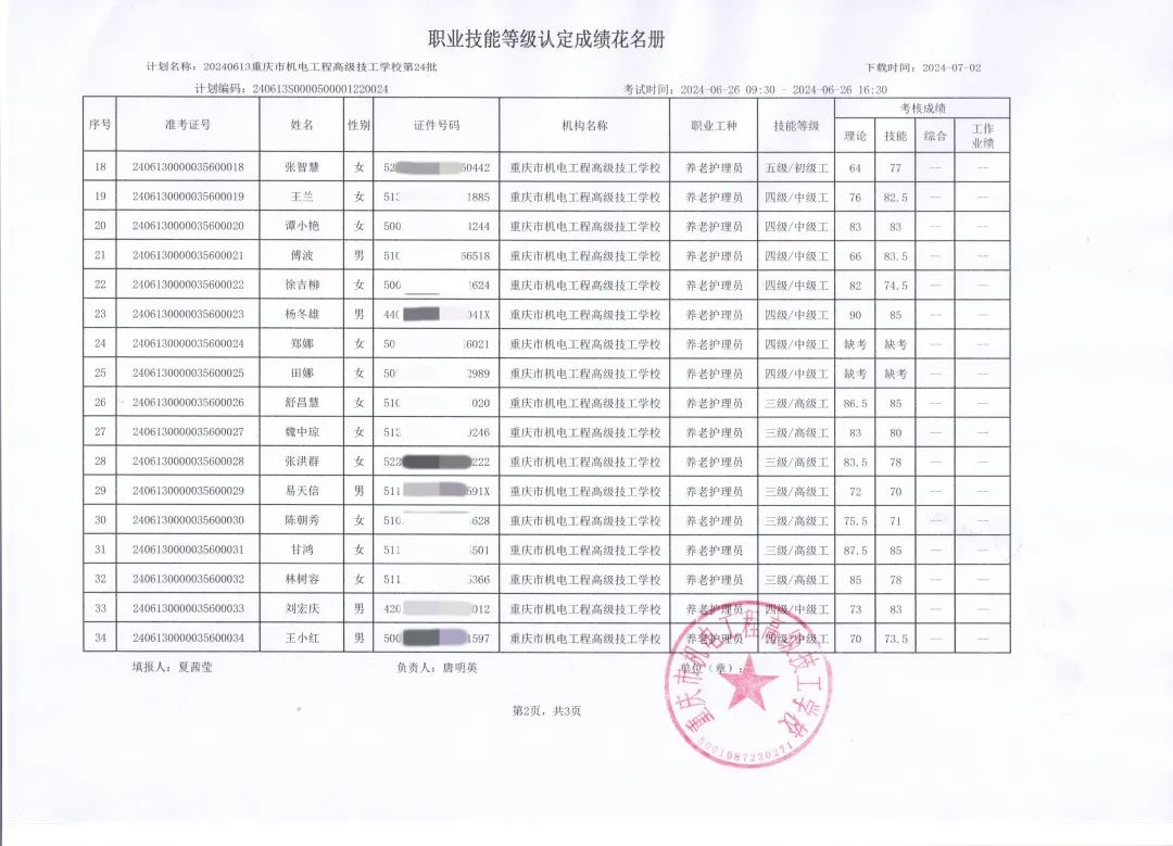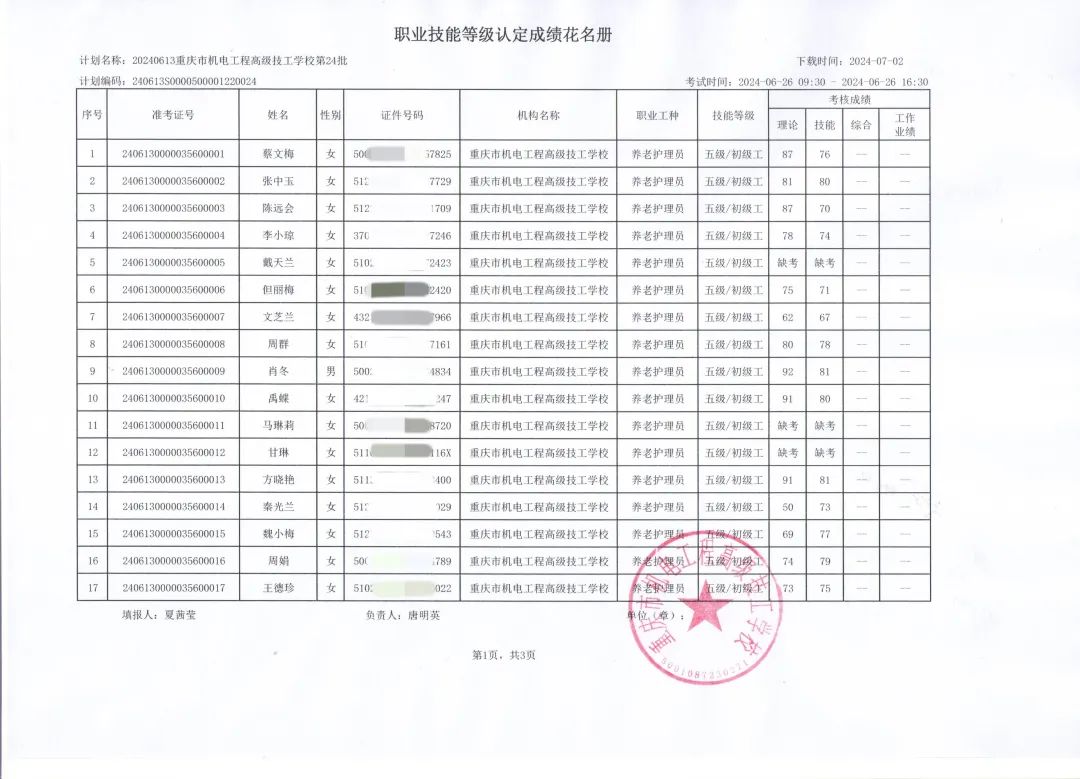 2024年6月重庆市机电工程高级技工学校市管社会培训评价组织对重庆市渝中区孝欣圜养老院、重庆市渝北区森林海养老院等社会人员进行了职业技能等级认定考试。认定工种:养老护理员,等级:高级/三级,中级/四级,初级/五级,报名43人,合格人数37人,缺考5人。合格率为86%。