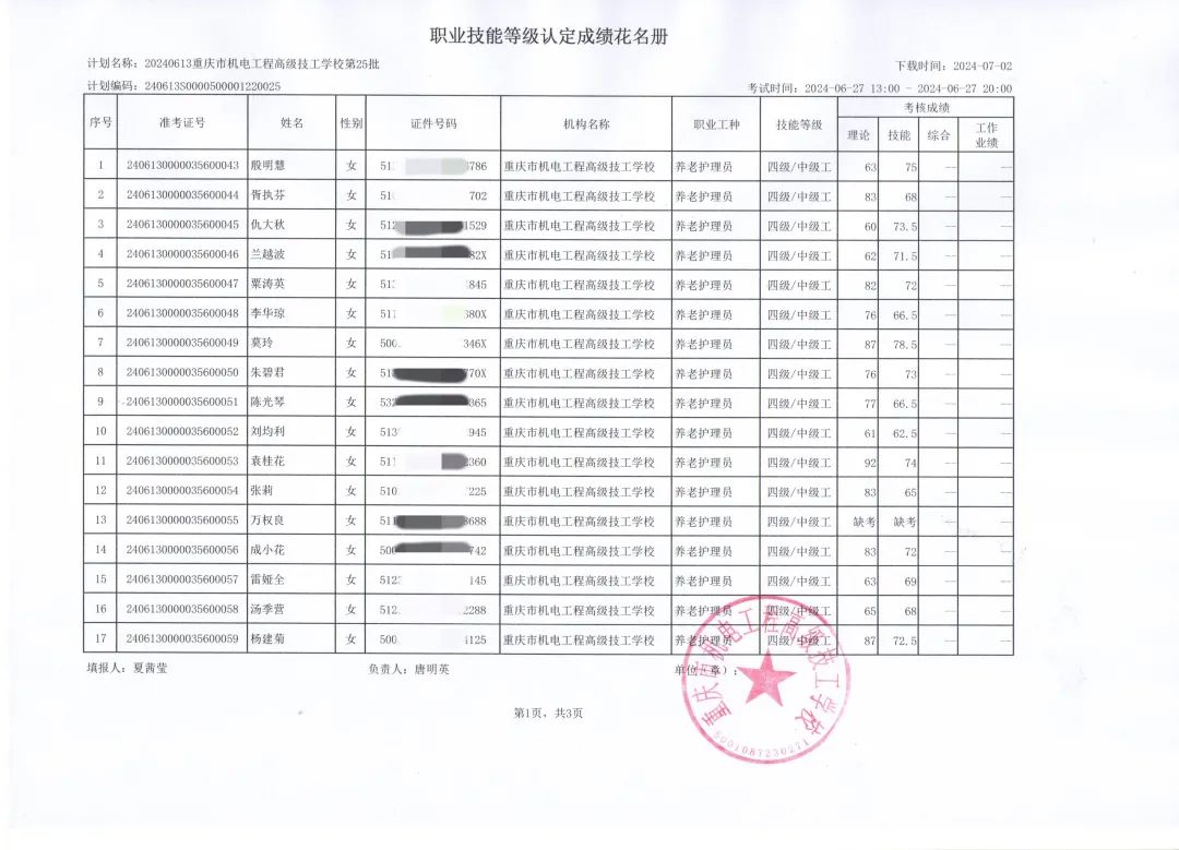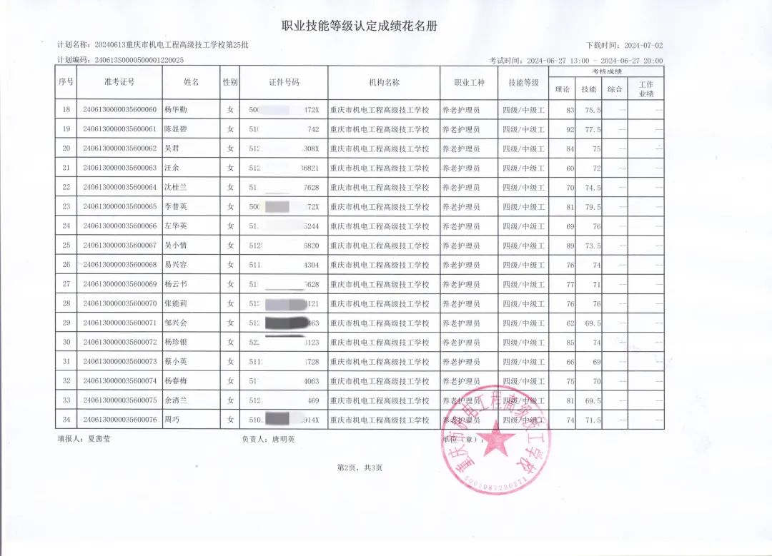 2024年6月重庆市机电工程高级技工学校市管社会培训评价组织对重庆大田小家家政服务有限公司等社会人员进行了职业技能等级认定考试。认定工种:养老护理员,等级:高级/三级,中级/四级,报名36人,合格人数34人,缺考2人。合格率为94%。