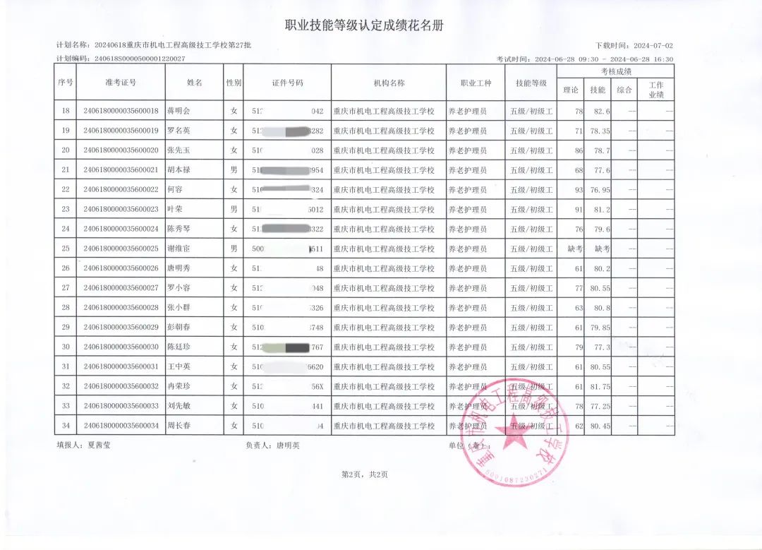 2024年6月重庆市机电工程高级技工学校市管社会培训评价组织对社会人员进行了职业技能等级认定考试。认定工种:养老护理员,等级:初级/五级,报名34人,合格人数32人,缺考1人。合格率为94%。
