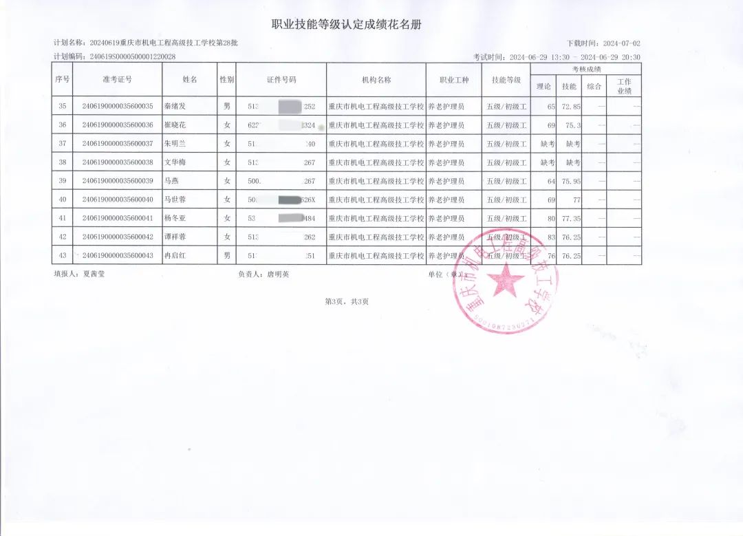2024年6月重庆市机电工程高级技工学校市管社会培训评价组织对精华职校的社会人员进行了职业技能等级认定考试。认定工种:养老护理员,等级:初级/五级,报名43人,合格人数37人,缺考6人。合格率为86%。