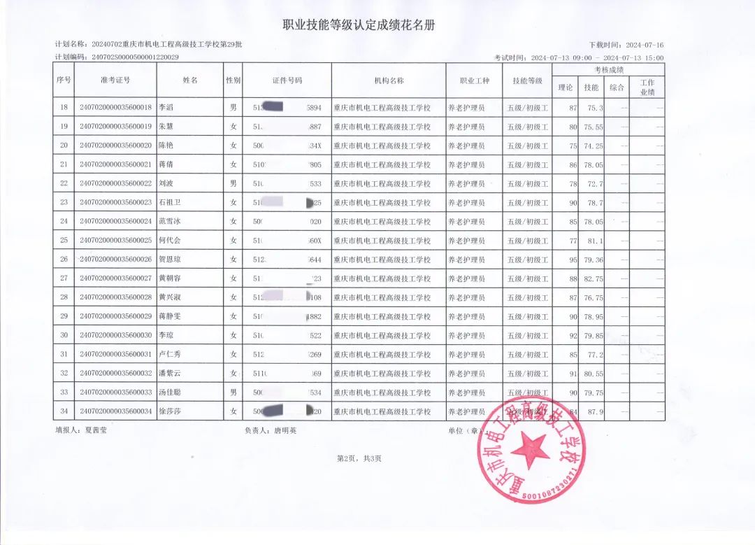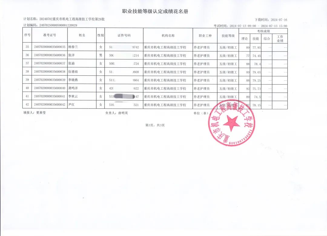 2024年7月重庆市机电工程高级技工学校市管社会培训评价组织对社会人员进行了职业技能等级认定考试。认定工种:养老护理员,等级:初级/五级,报名42人,合格人数37人,缺考2人。合格率为88%。