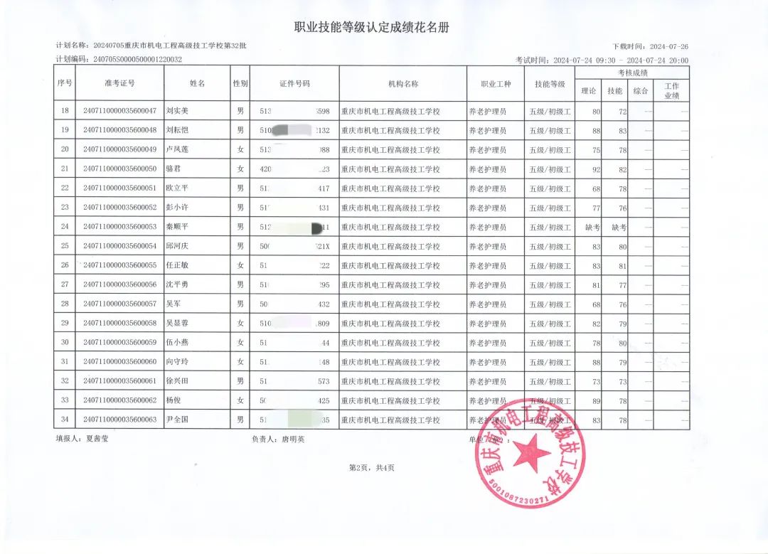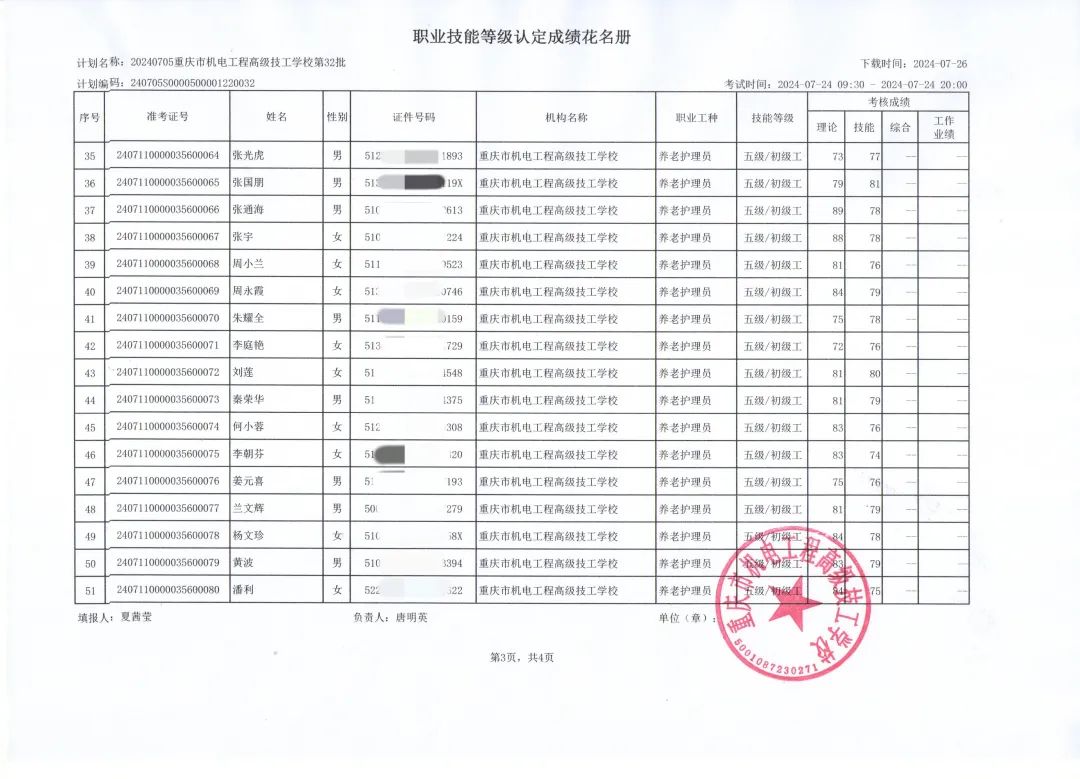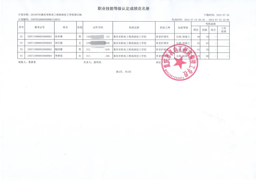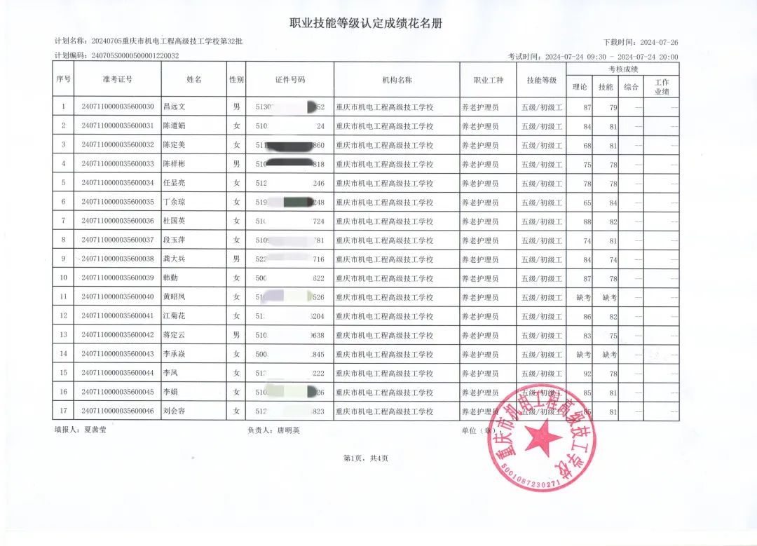 2024年7月重庆市机电工程高级技工学校市管社会培训评价组织对社会人员进行了职业技能等级认定考试。认定工种:养老护理员,等级:初级/五级,报名55人,合格人数52人,缺考3人。合格率为95%。