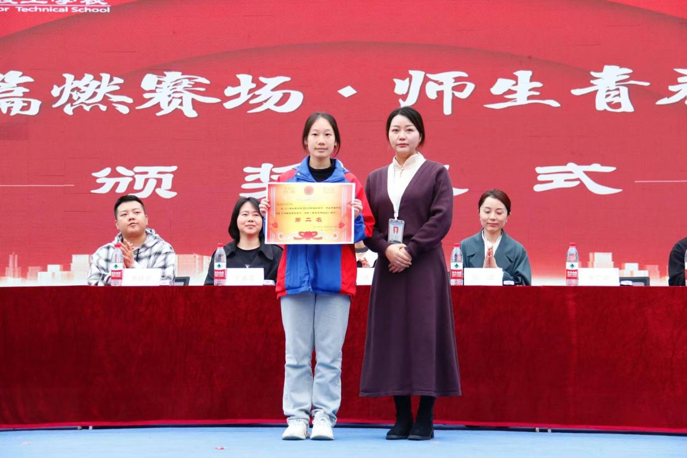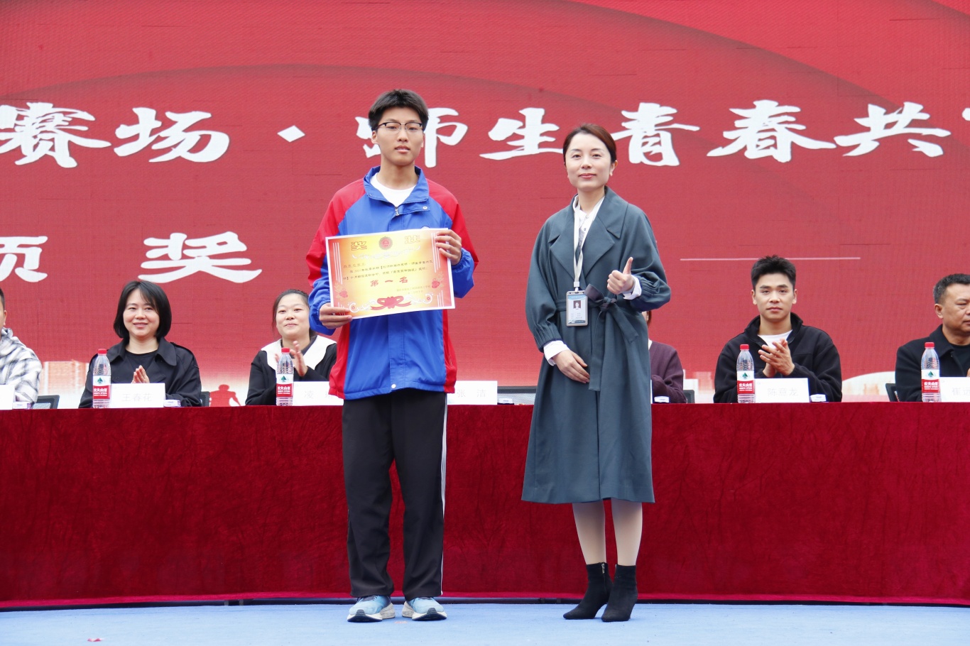 当树梢的片片秋叶记录下拼搏的剪影, 当激昂的呐喊声渐渐汇成收获的赞歌, 我校2025秋季田径运动会也迎来了圆满的终曲。 时光为轴,赛场为卷, 我们共同以青春为笔, 描绘了这幅名为“奋斗”的动人画卷。 秋色正好,韶光不负。2025年10月31日,为期一周的田径运动会伴随着收获与感动,在全校师生的共同见证下圆满收官。那些奔跑的身影、激情的呐喊、胜利的欢欣,都凝结成这个秋天最珍贵的记忆。此刻,让我们共同回首,走进这场闭幕式的荣耀殿堂。 闭幕式伊始,进入了激动人心的颁奖仪式。在激昂的乐曲和热烈的掌声中,各类奖项逐一揭晓,获奖代表依次上台,从校领导手中接过象征荣誉的奖牌与证书。这一刻,掌声为他们响起,荣耀为他们加冕! 23、24级女子200米 25级女子4x100 左右滑动查看更多